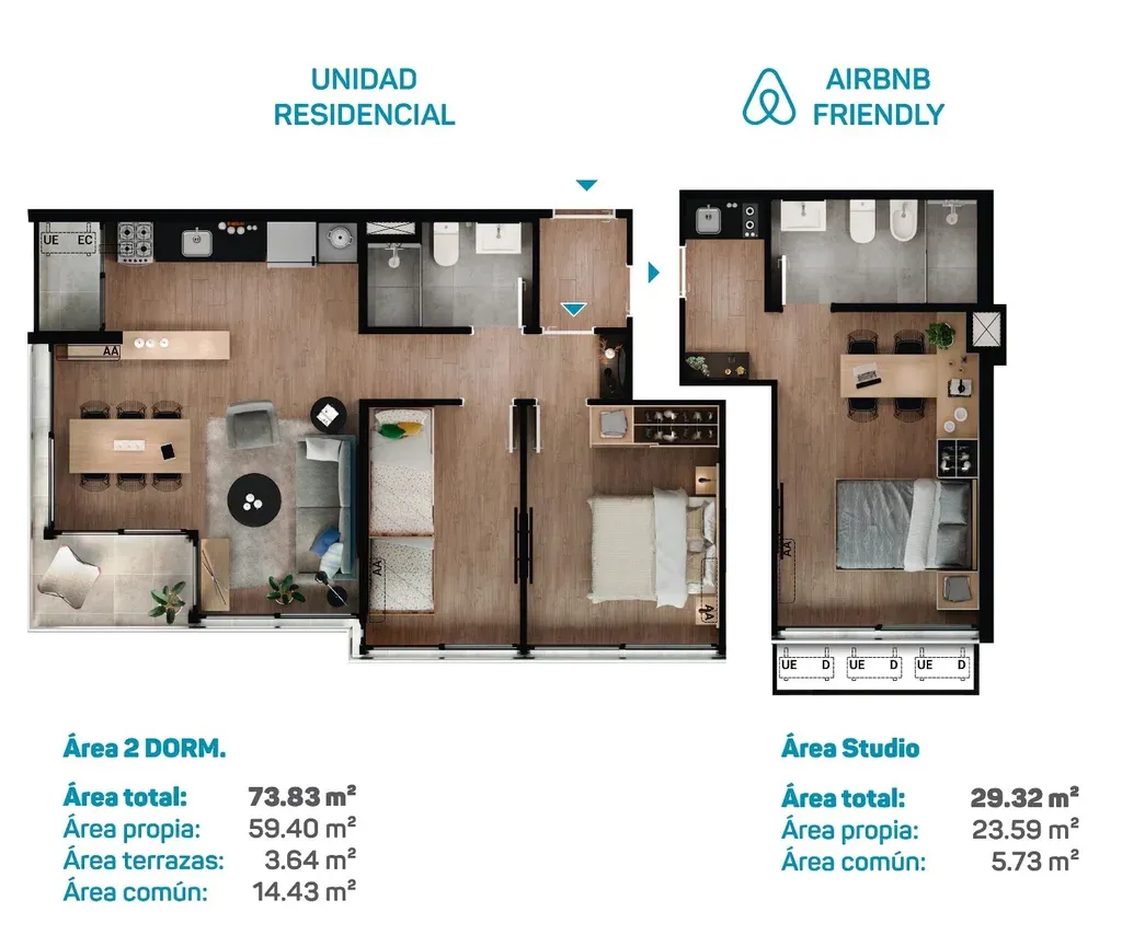 La propuesta cuenta con apartamentos monoambientes, de 1, 2 y 3 dormitorios con opción lock-off.