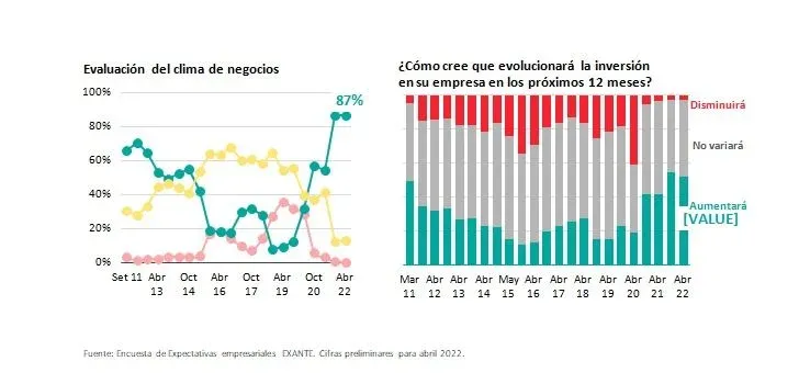 En relación a las expectativas empresariales, destacaron que el contexto se presenta favorable, , lo que permite aguardar un aumento de la inversión en 2022 y 2023. La encuesta de expectativas empresariales que Exante realiza cada seis meses marcado la mejor percepción del clima de negocios en más de 10 años.