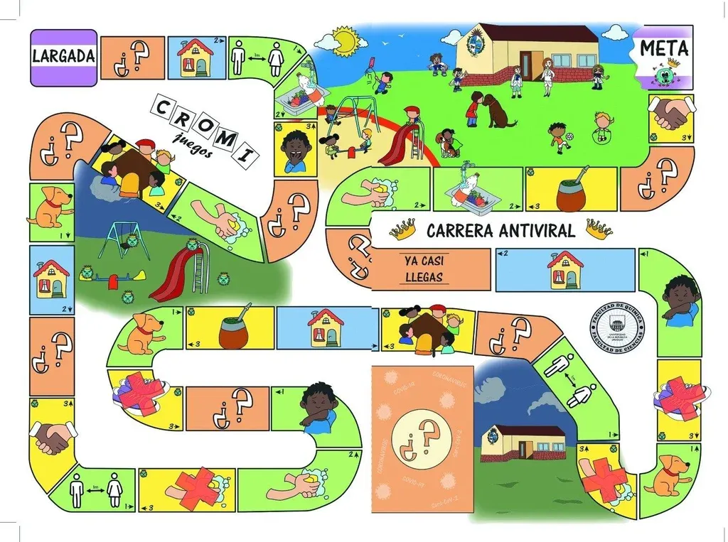 Cinco juegos. Estas cinco propuestas hechas en Uruguay para que los niños aprendan sobre el Covid-19, funcionan tanto en formatos digitales como físicos, por lo cual también pueden ser impresos para luego recortar, armar y pegar. La “Carrera antiviral” es un juego de la oca modernizado a tiempos pandémicos y muy bien diseñado por el Área de Microbiología de la Facultad de Ciencias y de la de Química de la Udelar. Pero hay más, incluyendo un dominó.