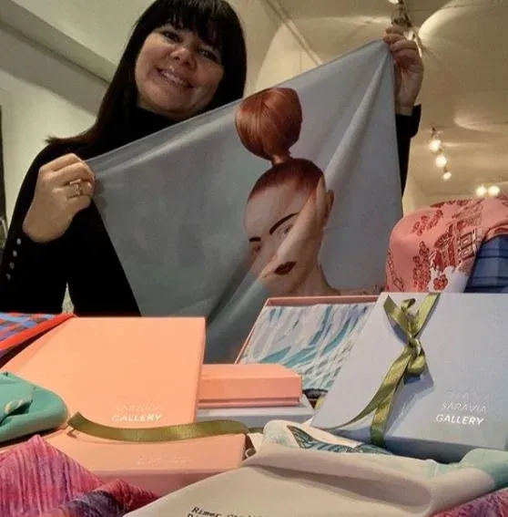 edición limitada de pañuelos de seda impresos con imágenes de obras de arte, cedidas a su galería por