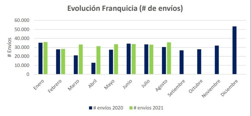 Estos datos derivan de los envíos incluidos bajo el régimen de franquicias, en compras realizadas por personas físicas mayores de edad, de hasta US$ 200 para los envíos recibidos por correo expreso y hasta US$ 50 para los recibidos por correo no expreso.