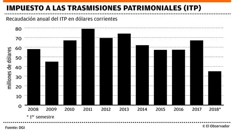 La cifra fue calculada por El Observador a partir de la recaudación correspondiente al Impuesto a las Trasmisiones Patrimoniales (ITP) que recauda la Dirección General Impositiva (DGI).