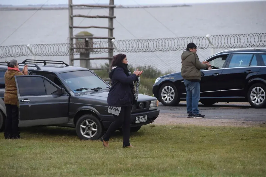 Una treintena de militares retirados se conglomeraron este lunes afuera de la base naval de Cerro y con banderas de Uruguay en sus espaldas aplaudieron a los féretros que llevaban los cuerpos de los tres infantes de la Marina asesinados el fin de semana en un destacamento militar.