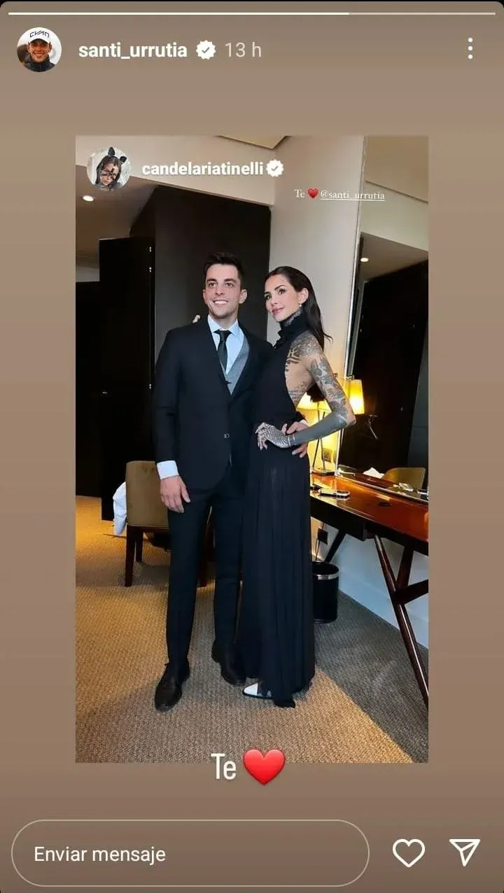 La influencer y el piloto de carreras se vistieron de gala y compartieron sus looks en las redes sociales. La primera en hacerlo fue Tinelli quien compartió la foto con un mensaje en el que mencionaba a Urrutia seguido de un "te" y el símbolo de corazón. La misma dedicatoria fue escrita por Urrutia que compartió la publicación de su enamorada también como historia de Instagram.