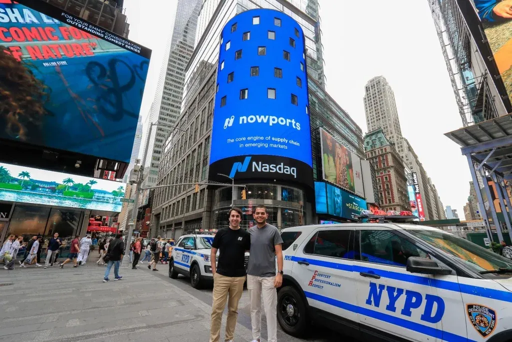 Gentileza Nowports Maximiliano Casal y Alfonso de los Ríos, fundadores de Nowports, frente a la pantalla de Nasdaq, en Times Square (Nueva York) Esto de “llegar a varios países con su producto o servicio”, con el objetivo de aumentar su escala y valor les facilita la posibilidad de transformarse en unicornios, señaló Brenner.