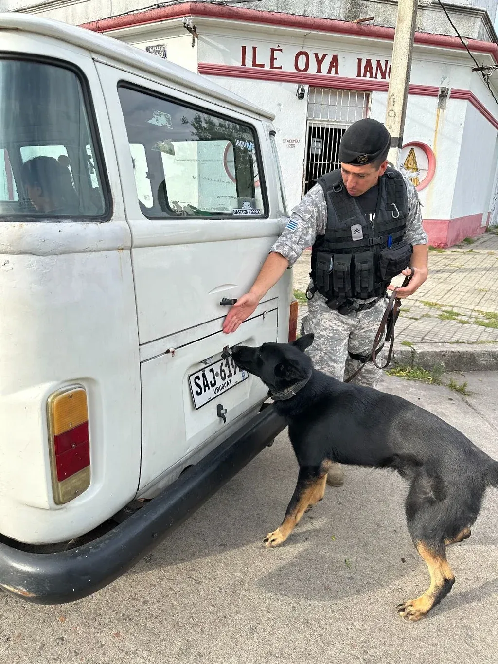 Una familia se traslada en una camioneta Volkswagen Kombi y el perro recorre todo el vehículo en busca de sustancias. El conductor dice que vive en la zona y que está acostumbrado a que lo paren cuando anda en moto, que el barrio "está más tranquilo" por la presencia policial y bromea: "Tranquilo es un decir". La familia tiene la documentación y el vehículo en regla y puede seguir.