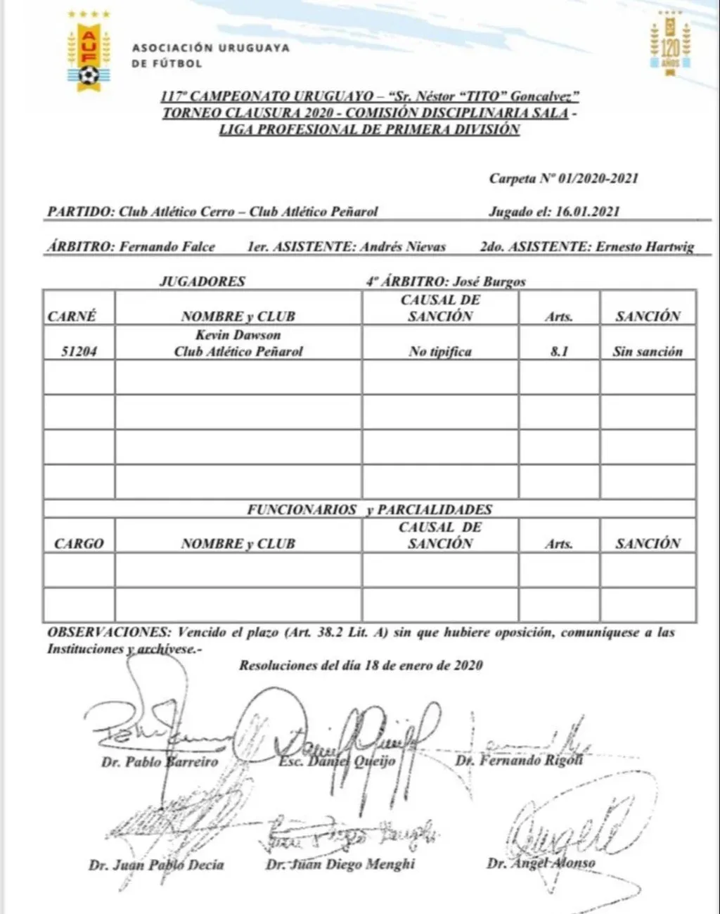 La Comisión Disciplinaria de la Asociación Uruguaya de Fútbol (AUF) dejó en evidencia el claro error del árbitro del partido entre Cerro y Peñarol en el debut de ambos en el Torneo Clausura el pasado sábado en el estadio Luis Tróccoli, Fernando Falce, al haber expulsado erróneamente al arquero aurinegro, Kevin Dawson, en la jugada del penal que le dio el empate a los cerrenses.