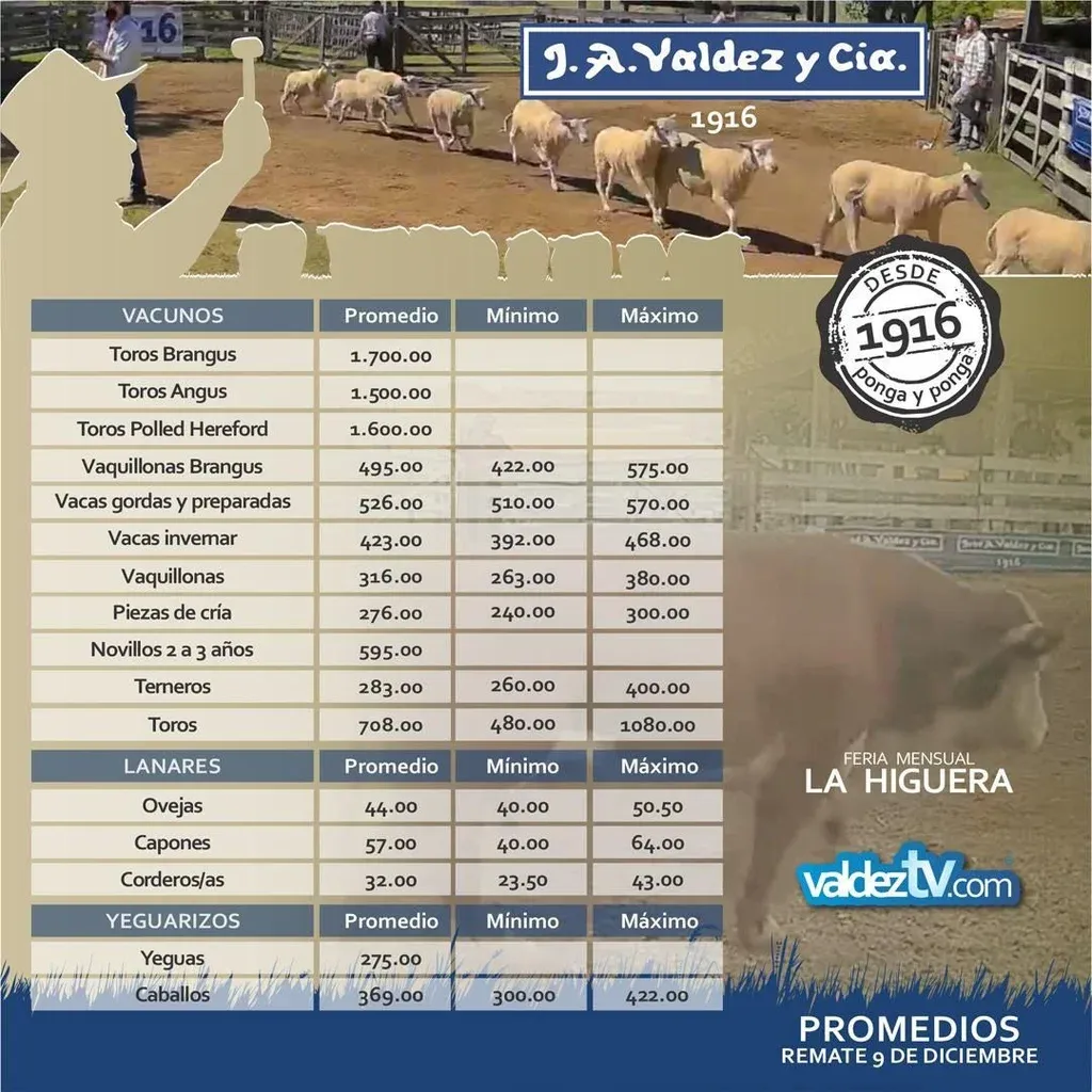 La oferta de vacunos que puso a consideración Valdez y Cía incluía toros Brangus, Aberdeen Angus y Polled Hereford; vaquillonas, vacas gordas y preparadas, vacas de invernar, piezas de cría, novillos y terneros.