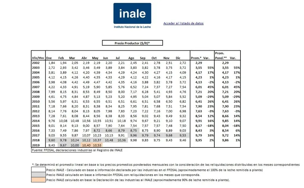 Según se informó, el precio desde junio de 2019 para 3,92% GB y 3,44% PR es un promedio de $ 10,70 por litro, pero con 100% de aporte CL y 19% de calidad llega a $ 10,90 por litro. Se indicó que hay un ajuste sobre prima extra que involucra un aumento de $ 3,50 a $ 8 por kgilo de sólido respaldado.
