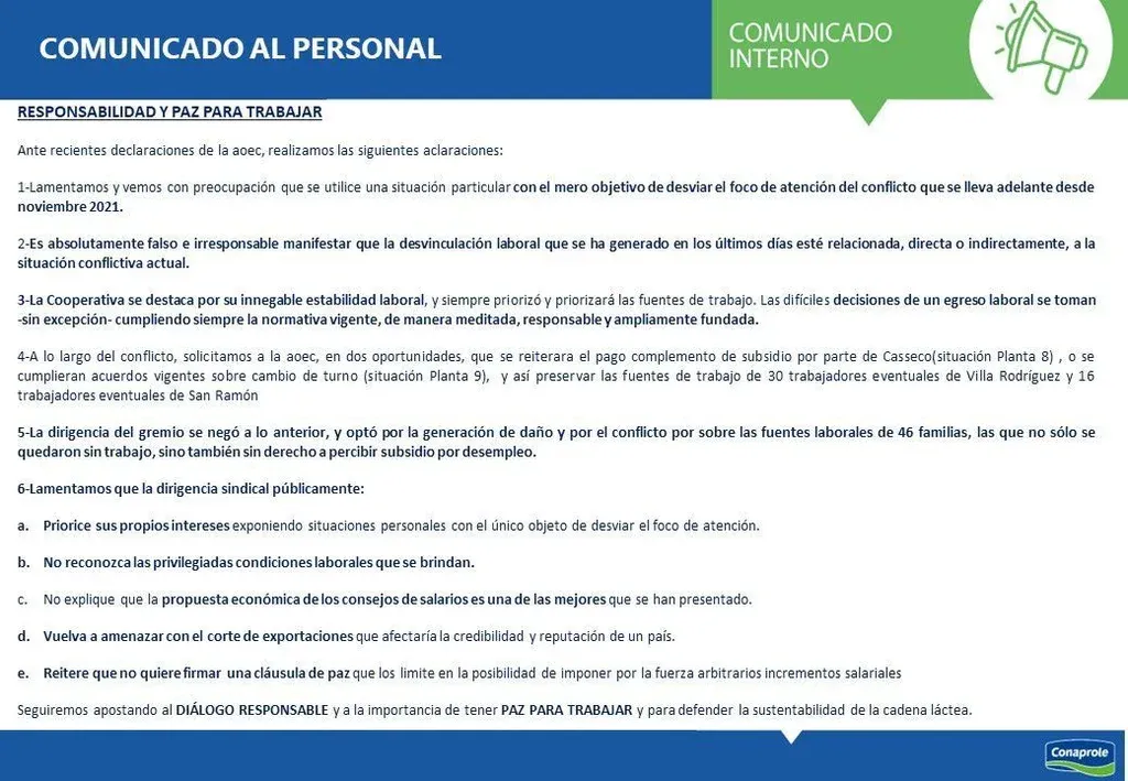 Al respecto, Conaprole informó al personal que esa situación se utiliza “con el mero objetivo de desviar el foco de atención del conflicto”, citando además que ese conflicto sucede desde noviembre del año pasado.
