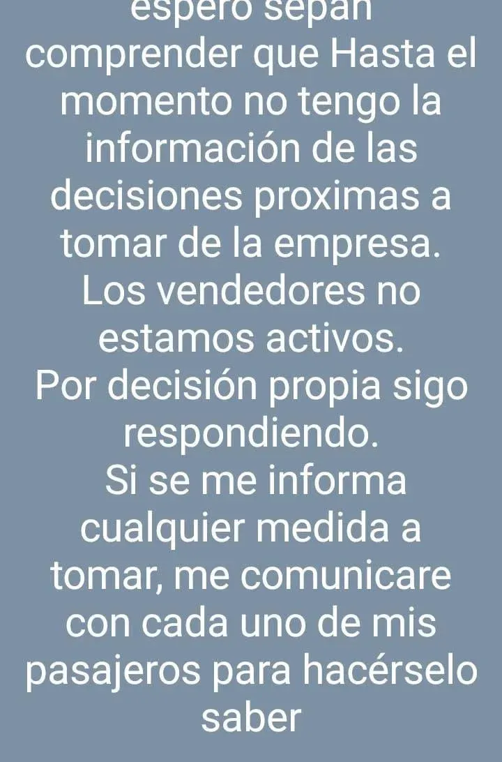 La tarde de este martes agarra su celular, abre "Añadir a mi estado", en WhatsApp, y escribe: "Espero sepan comprender que hasta el momento no tengo la información de las decisiones próximas a tomar de la empresa. Los vendedores no estamos activos. Por decisión propia sigo respondiendo. Si se me informa cualquier medida a tomar, me comunicaré con cada uno de mis pasajeros para hacérselo saber".