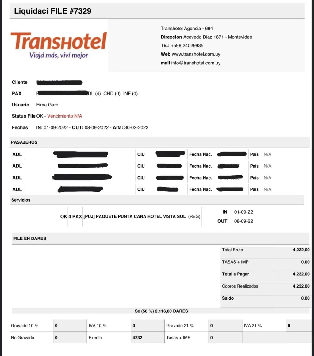 Su hija Cecilia dijo a El Observador que el 18 de mayo de 2022 la mujer compró mediante Transhotel un pasaje aéreo a Madrid para la segunda quincena de octubre. "No le dieron factura, solo un recibo oficial y un documento denominado 'Liquidación' (similar a la imagen anterior)".