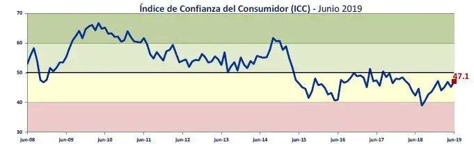 El Índice de Confianza del Consumidor (ICC) de junio se situó en 47,1 puntos, 1,8 puntos por encima del dato del mes anterior y permanece en zona de moderado pesimismo.