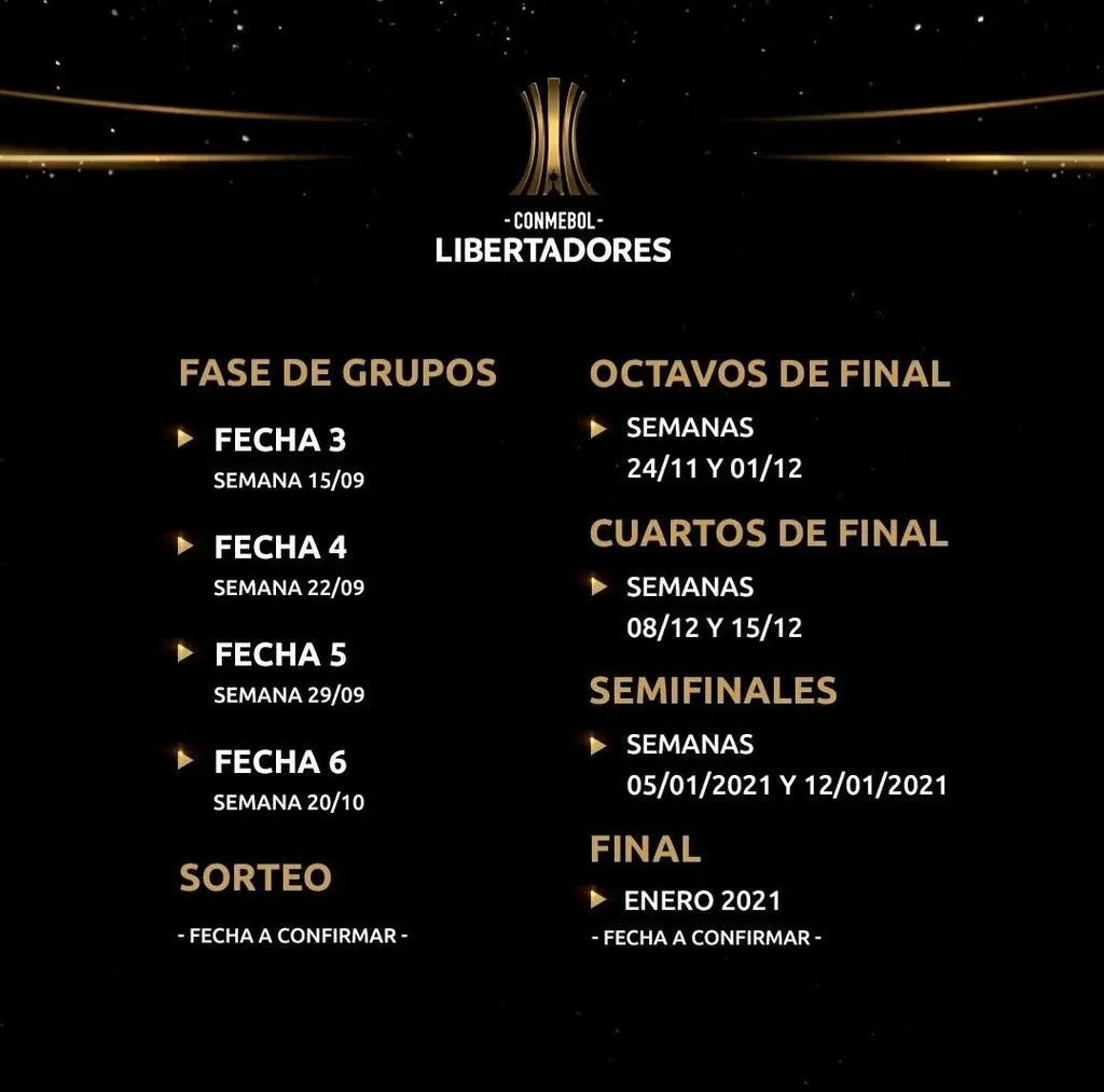 La Copa LIbertadores volverá el 15 de setiembre con la tercera fecha de los grupos, la que se disputará hasta el 20 de dicho mes.