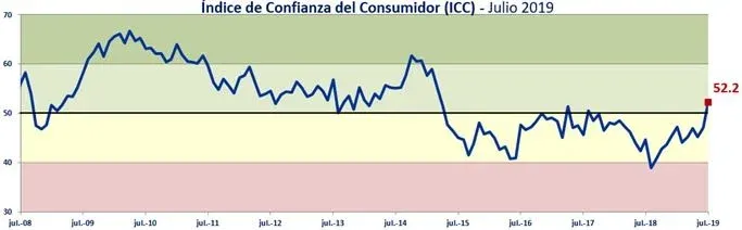De acuerdo al Índice de Confianza del Consumidor (ICC) -que elabora la Cátedra Sura de Confianza Económica de la Universidad Católica con Equipos Consultores- en julio el ICC avanzó 5,1 puntos (a 52,5 unidades); así avanzó a la zona de moderado optimismo y dejó atrás un período de pesimismo que se había iniciado en agosto de 2017. Asimismo, el indicador mostró su mayor nivel en 4 años, esto es desde marzo de 2015 (55 puntos), cuando asumió la actual administración de gobierno y se "agotaba" el anterior ciclo electoral.