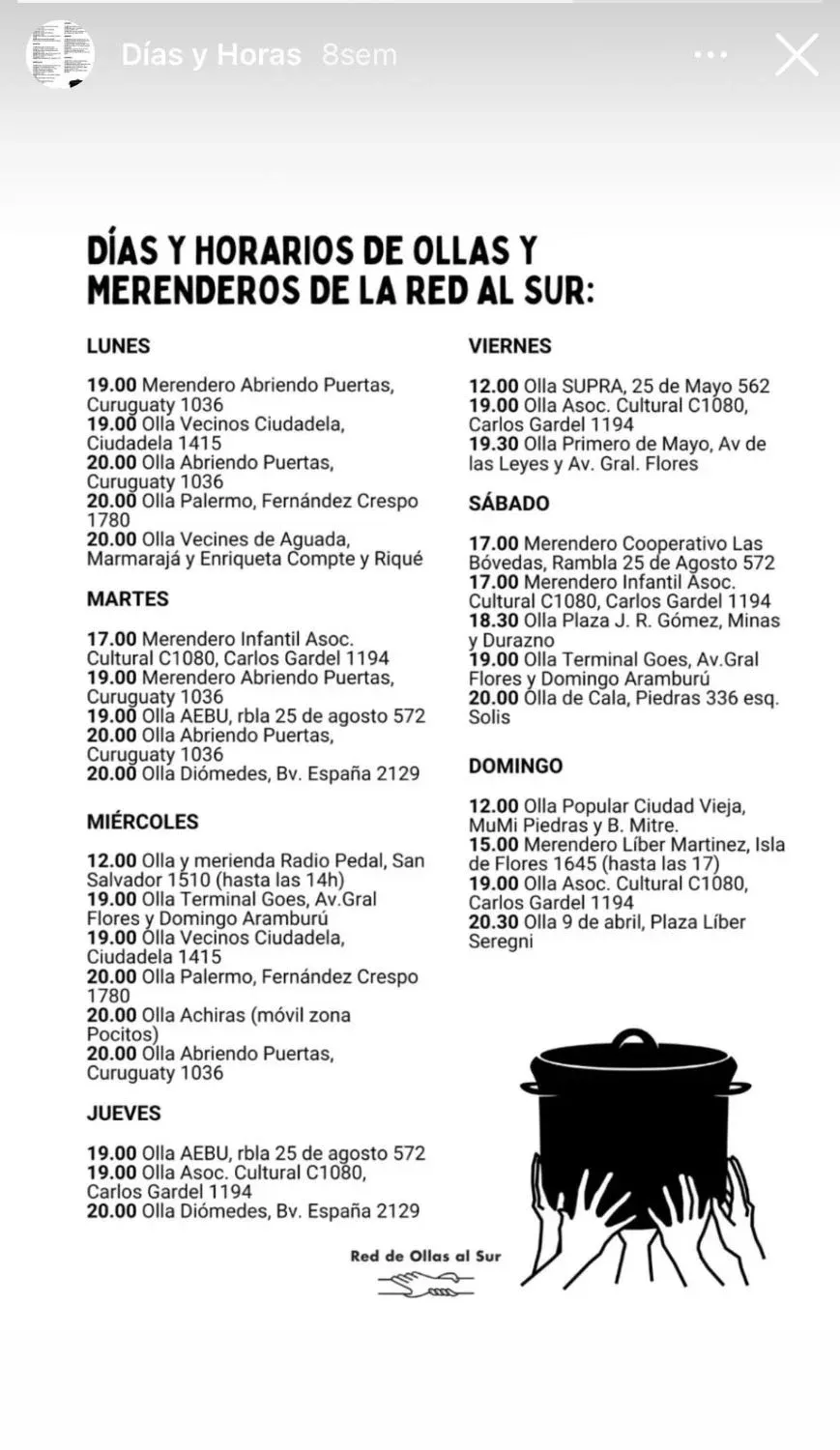 Según explicó el vocero de CPS, los datos en cuanto a días y horarios están publicados en la cuenta de Instagram Red de Ollas del Sur.