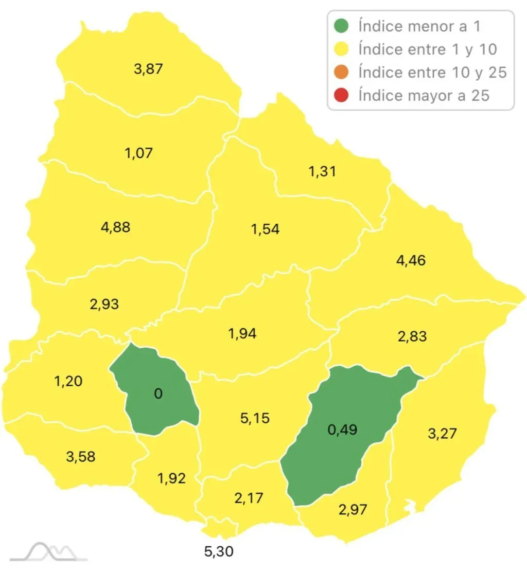 Hoy Uruguay tiene 17 departamentos en amarillo en el índice de Harvard. Solo Flores y Lavalleja están en verde porque este viernes Salto y Rivera pasaron al nivel de riesgo amarillo.