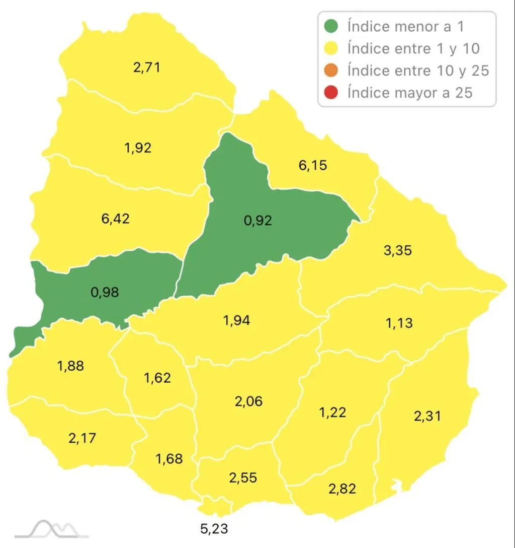 Con los datos de este sábado, Lavalleja subió a amarillo en el nivel de riesgo que establece el índice de Harvard. Además, Río Negro pasó a verde y ahora se ubica en ese nivel junto a Tacuarembó. Hay 17 departamentos en amarillo.