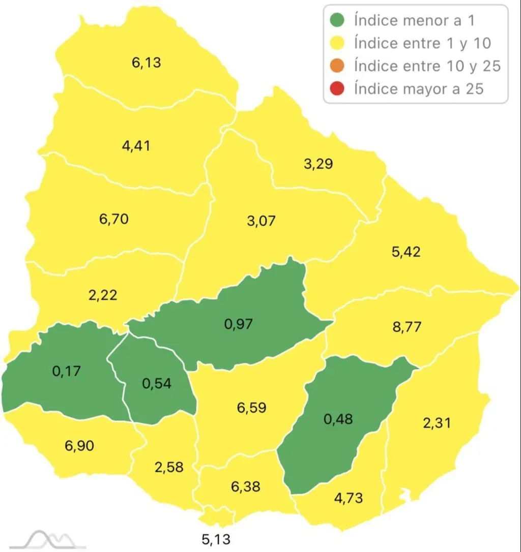 Con los datos de este sábado, hay cuatro departamentos que se mantienen en verde, de acuerdo al índice de Harvard que calcula los contagios cada 100 mil habitantes, en el promedio de los últimos siete días. Son Lavalleja, Soriano, Flores y Durazno.