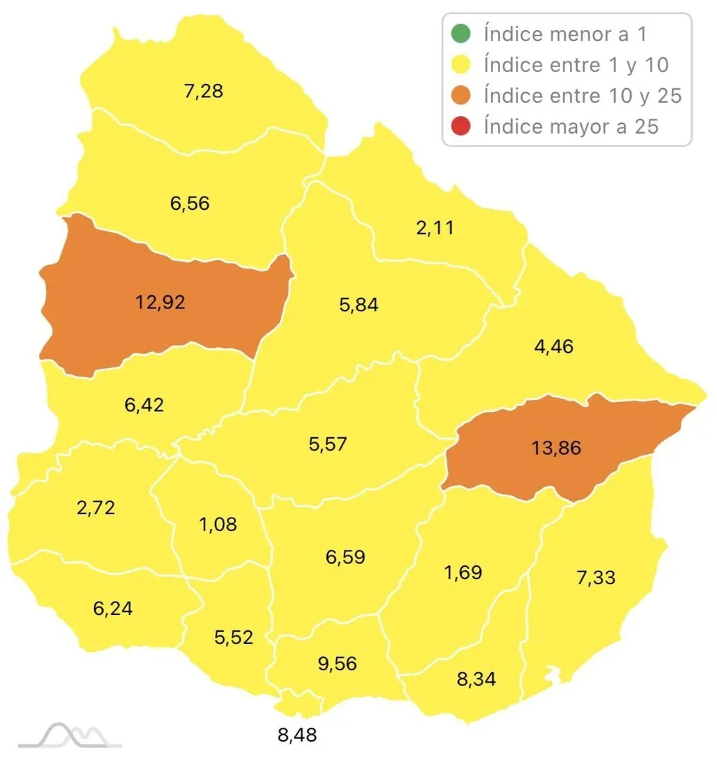 No hay departamentos en rojo ni en verde. A nivel país, Uruguay se posiciona en nivel amarillo, con 8,7 casos cada 100 mil habitantes, y necesitará tener menos de uno para estar en color verde.