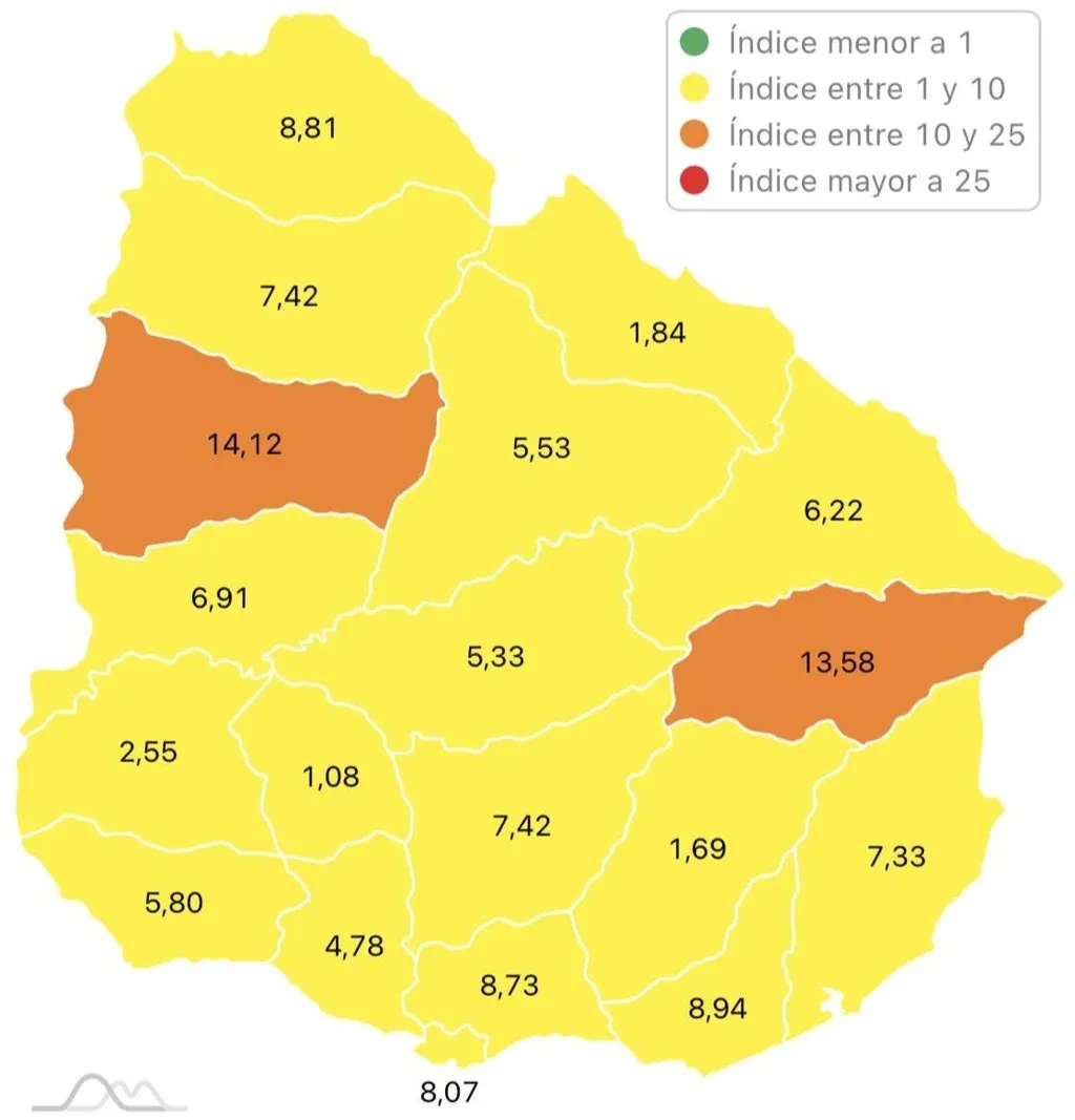 Si bien hubo variación de valores en el índice de Harvard, en comparación con este miércoles el mapa no presenta cambios de departamentos hacia otras zonas de riesgo. A nivel país, Uruguay continúa en amarillo pero con la cantidad de contagios cada 100 mil habitantes en la última semana, con números a la baja. Hoy esa cifra se posiciona en 7,85.