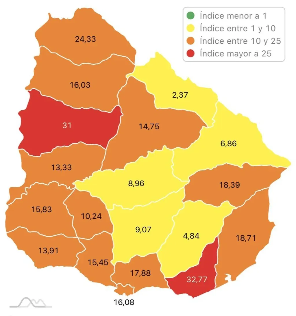 A nivel país, Uruguay está en naranja, porque tiene 17,28 casos cada 100 mil habitantes. Necesitará tener menos de 10 para descender un nuevo escalón.