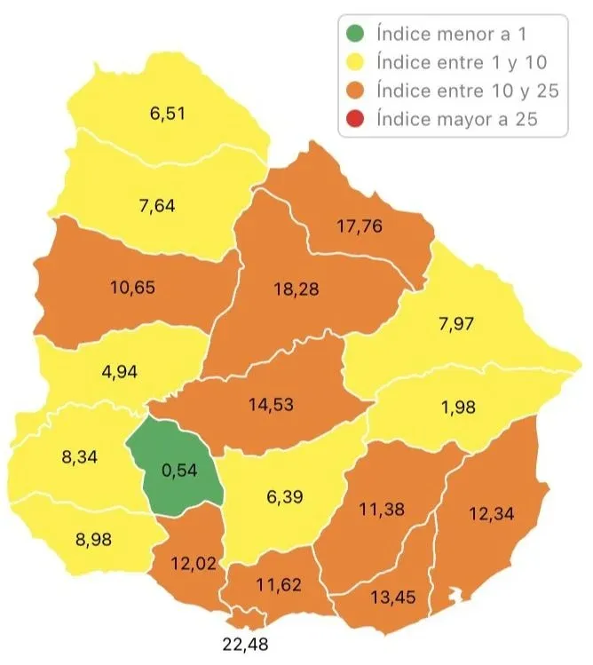Diez departamentos se ubicaron en zona naranja –Canelones, Durazno, Lavalleja, Maldonado, Montevideo, Paysandú, Rivera, Rocha, San José y Tacuarembó–, ocho en zona amarilla –Artigas, Cerro Largo, Colonia, Florida, Río Negro, Salto, Soriano y Treinta y Tres– y uno, Florida, en zona verde. Desde el miércoles no hay ningún departamento en zona roja; ese día salió Rivera, el último que quedaba. Montevideo dejó la franja más crítica el sábado 30.
