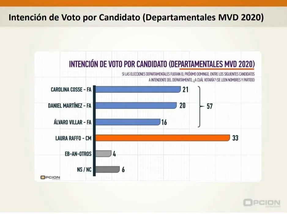 "El Frente Amplio sigue preservando una diferencia importante el bloque multicolor de cara a las elecciones departamentales de la capital. La tercera medición del año confirma una tendencia básicamente estable, con oscilaciones menores comprendidas dentro del margen de error estadístico", señaló la investigación de Opción.
