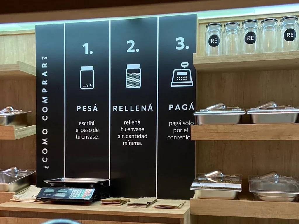 El usuario cuenta con la posibilidad de reutilizar los recipientes para hacerse de lo que necesita y pagar solo por el producto o llevar los productos en bolsas de papel reciclado, que no tienen costo.