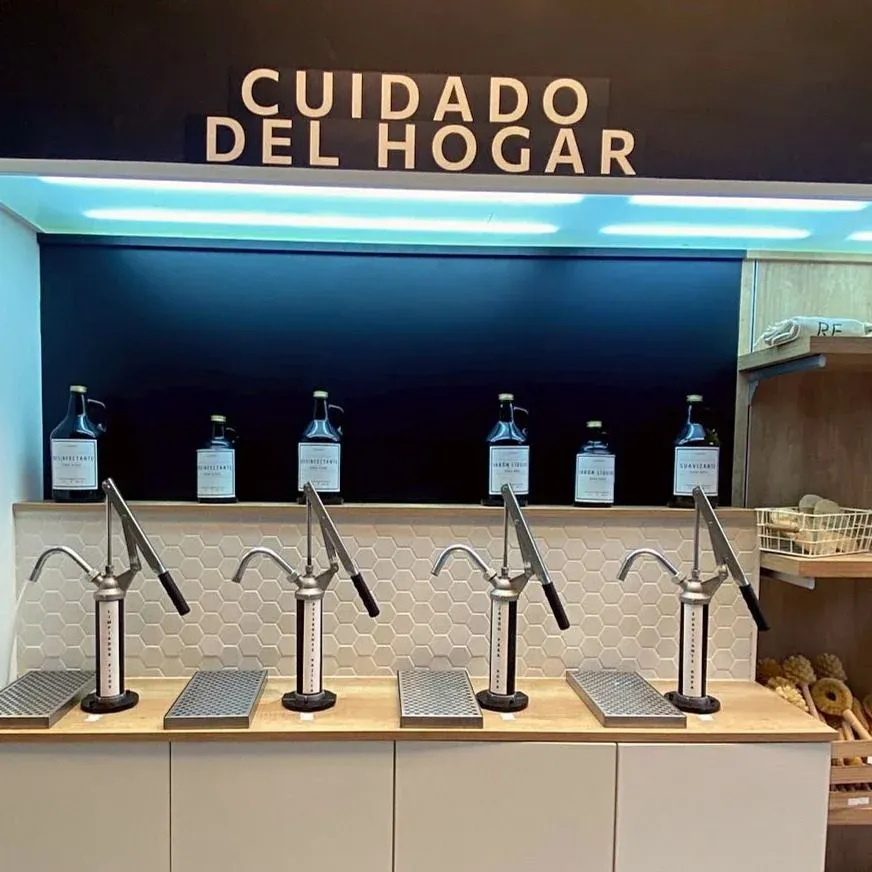 El cliente puede ir con sus propios envases y recargarlo con el producto que desea; también puede comprar envases reutilizables en la tienda