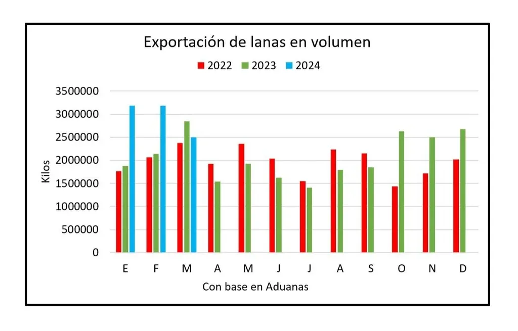 En marzo las exportaciones fueron inferiores a las del mismo mes de 2023, pero el importante incremento en enero y febrero permitió mantener al alza el acumulado anual, particularmente por el crecimiento en la colocación de lotes de lanas medias y gruesas.