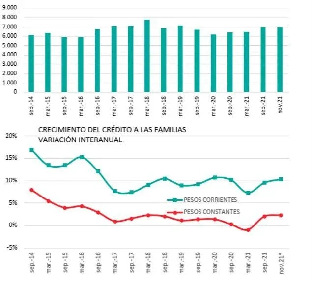 El stock de crédito a las familias, medido en dólares, da un nivel de US$ 6.957 millones a noviembre, según la estimación primaria de los servicios técnicos de Pronto!.