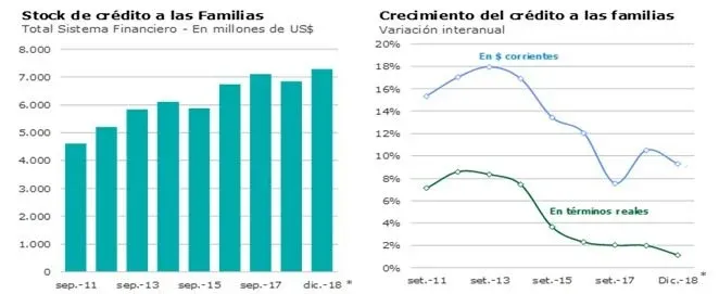 El crédito a las familias siguió creciendo a tasas reales moderadas, y a fin de 2018 se ubicó algo por encima de los US$ 7.000 millones. La evolución del crédito a las familias, medida en moneda local, muestra que al cierre del tercer trimestre la tasa de crecimiento interanual era de 9%, pero que al quitar el efecto inflacionario, eso se reduce sustancialmente.