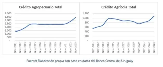 De acuerdo a la última información disponible del Banco Central del Uruguay (BCU), los préstamos bancarios al sector agropecuario son de US$ 3.422 millones (a noviembre de 2023), por lo que se ubican en valores máximos en dólares corrientes.