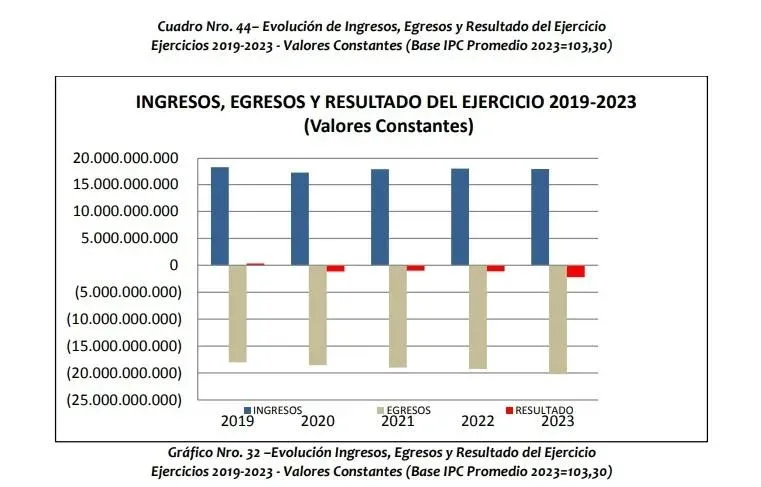 El texto expuso que en el último quinquenio solamente en 2019 se registró superávit, mientras que en 2023 se verificó el mayor déficit del período. En 2019 el resultado positivo fue de $ 358,8 millones. Los restantes ejercicios dieron pérdida. En 2020 el déficit fue de $ 1.157 millones; en 2021 de $ 1.000 millones y en 2022 de $ 1.117 millones. El resultado del período observado fue deficitario en US$ 133,2 millones.