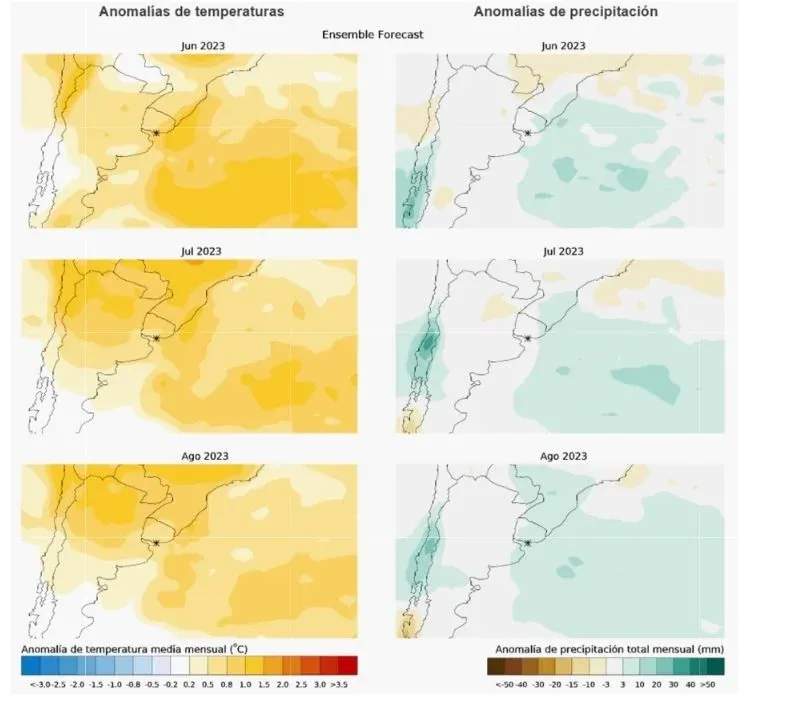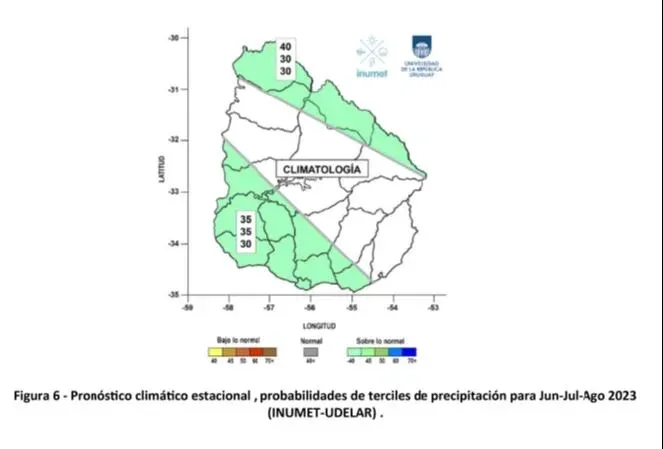 Además Inumet agrega un pronóstico climático estacional de precipitación, que sostiene que la previsión de lluvias para el trimestre es superior a lo normal en la globalidad del trimestre junio-agosto, mientras que en el centro del territorio "no se dispone de una señal clara hacia sesgos negativos o positivos".