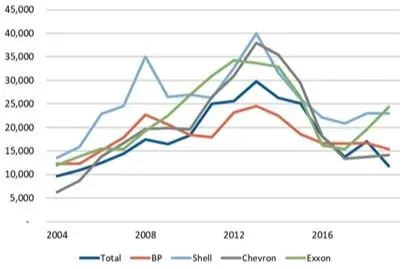 CAPEX: gasto de capital de las grandes compañías petroleras (2004-2018). Fuente: Institute for Energy Economics and Financial Analysis (2019)