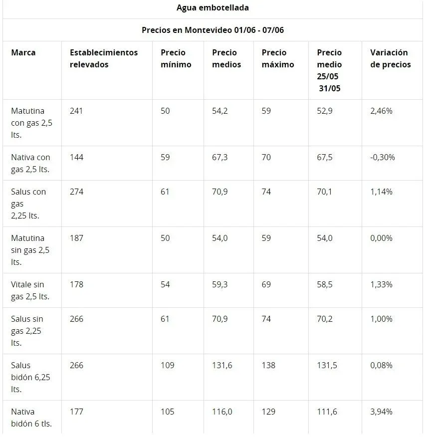 Los datos informados por los establecimientos de Montevideo al Sistema de Información de Precios al Consumidor (SIPC) se basan en lo sucedido entre el 1° y 7 de junio 2023. El precio medio de este producto se mantuvo similar al observado en igual periodo anterior (25 al 31 de mayo), con excepción del agua con gas Matutina 2.5 lts. y el bidón Nativa 6 lts. que presentan aumento de precio. En el primer caso la variación fue de unos $ 2 (2,46 %) y en el segundo de casi $ 5 (3,46%).