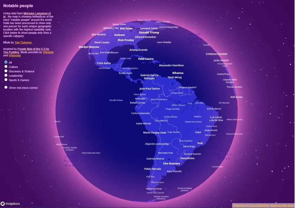 El sitio Github creó un mapa interactivo del globo terráqueo que muestra dónde nacieron las personalidades históricas y de la actualidad más reconocidas del arte, el deporte y la política de los distintos países.