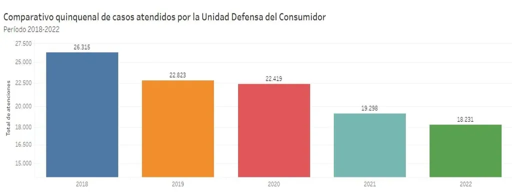 La dependencia del Ministerio de Economía (MEF) informó que en total atendió 18.231 casos durante 2021 con una baja interanual de 5,5%. En 2021 habían sido 19.298, también con un descenso frente a un año atrás cuando llegaron a 22.419. El informe explicó que la caída total de los casos se produjo porque a partir de 2020, la oficina dejó de atender consultas y reclamos relativos a comunicaciones que son competencia de la Unidad Reguladora de Servicios de Comunicaciones (Ursec) como también de servicios de energía y agua corriente derivadas a la Unidad Reguladora de Servicios de Energía y Agua (Ursea).