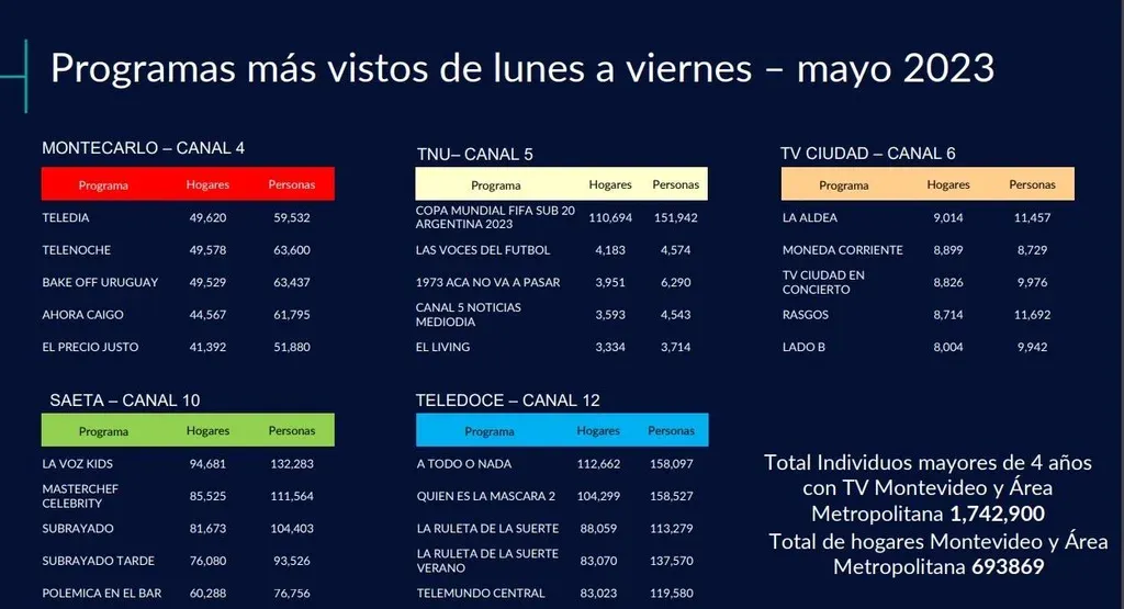 En el desglose canal a canal, las mediciones marcan que el programa más visto de Canal 4 es el noticiero matutino Teledía (7,15 puntos), en Canal 10 fue el certamen La Voz Kids (13,6 puntos), y La Aldea, el programa de humor y actualidad que conduce Diego González, fue el más visto en el caso de TV Ciudad (1,2 puntos).