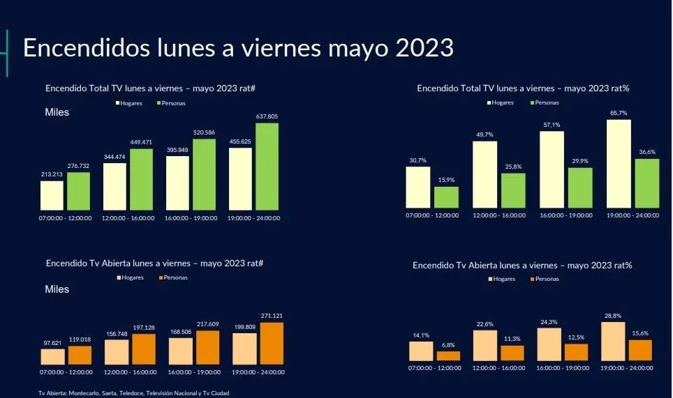 Las cifras marcan que el período del día en el que los uruguayos ven más televisión abierta (que abarca a los canales privados 4, 10 y 12, además del canal 5 estatal y el municipal TV Ciudad) es el que va desde las 19 horas hasta la medianoche, donde los canales suelen concentrar sus noticieros centrales y sus apuestas de entretenimiento más fuertes.