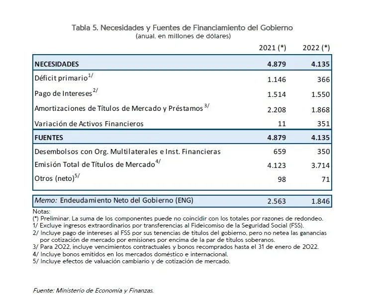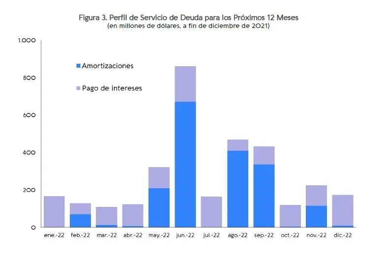 Por otro lado, el informe da cuenta que a enero de 2022, los activos líquidos del gobierno eran de US$ 1.834 millones y las líneas de crédito con organismos multilaterales (Banco Interamericano de Desarrollo, Corporación Andina de Fomento y Fondo Latinoamericano de Reservas) sumaban US$ 1.865 millones. “Tomada en conjunto, la liquidez precautoria es suficiente para cubrir todo el servicio de deuda entre febrero de 2022 y enero de 2023”, destaca.