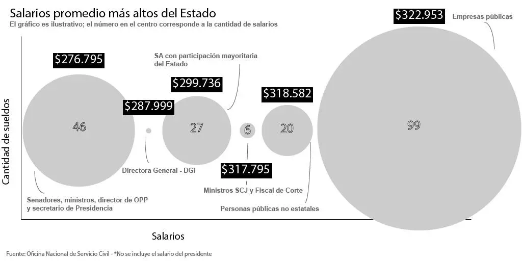 Si bien el promedio es de $ 323 mil mensuales, hay varios salarios que están por encima de esos números. Los gerentes generales de las empresas públicas (Ancap, BROU, UTE, entre otras), por ejemplo, cobran alrededor de $ 350 mil nominales según información recabada por El Observador a través de solicitudes de acceso a la información.