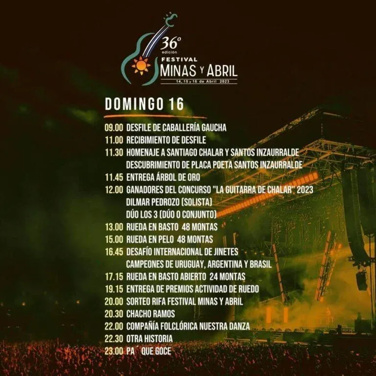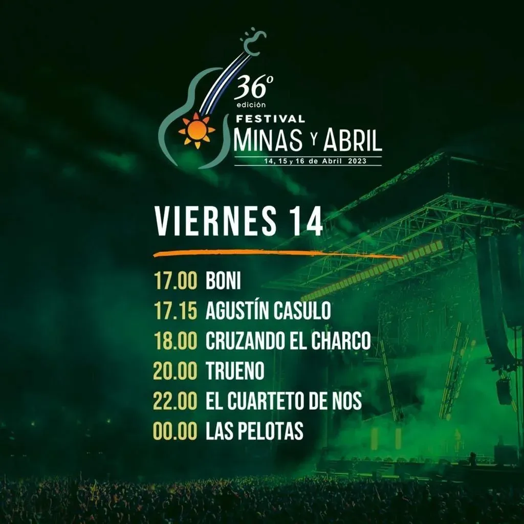 Desde este viernes hasta el domingo, tendrá lugar el clásico festival Minas y Abril la capital de Lavalleja, que contará con artistas como Cruzando el Charco, Trueno, El Cuarteto de Nos, Las Pelotas, Matías Valdéz, Soledad y Chacho Ramos.
