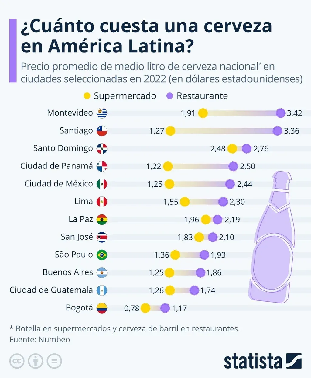 Según la base de datos Numbeo, comprarse una cerveza en la capital de Colombia, Bogotá, ya sea en el supermercado o en un restaurante, puede costar menos de la mitad que en Montevideo. En Uruguay el producto de medio litro nacional tiene un precio promedio de US$ 1,91 en el supermercado y de US$ 3,42 en un restaurante.