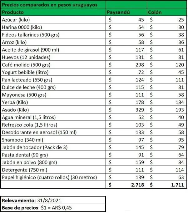 Si llevamos estos números al día a día de los ciudadanos del litoral, en la principal cadena de supermercados de Paysandú, una canasta integrada por 22 productos seleccionada por El Observador -entre los que hay harina, fideos, azúcar, arroz, pan, yerba, agua mineral, asado, junto con artículos de higiene personal y limpieza- tiene un costo de $ 2.718. La misma canasta en uno de los principales supermercados de Colón vale $ 1.711, lo que quiere decir un 37% más barato. A modo de ejemplo, un kilo de asado vale $ 329 en Paysandú y $ 193 en Colón.