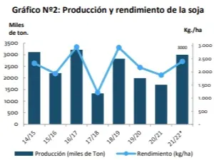El incremento esperado en la producción de soja se explica por un aumento de 15% en el área sembrada y por expectativas de rendimiento promedio mayores a 2,4 ton/ha, 30% por encima de lo registrado en la zafra 2020/2017. La mayor área sembrada y la mejora en el rendimiento por hectárea permitiría alcanzar una producción cercana a los 3 millones de toneladas en 2022.