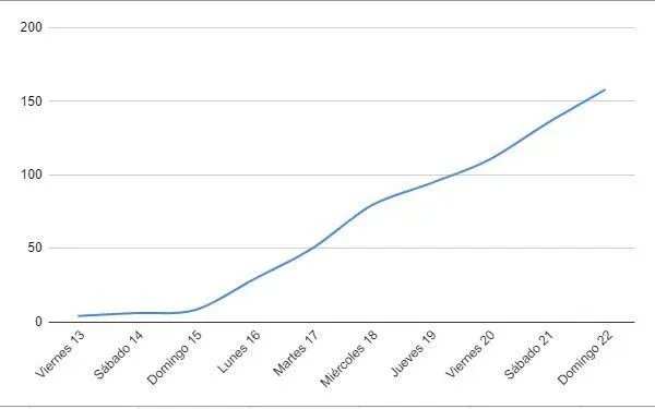 Casos confirmados por día desde el viernes 13, según datos del MSP.