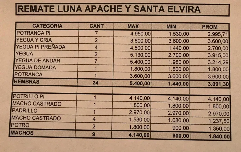 Las hembras alcanzaron un precio máximo de US$ 5.400, un mínimo de US$ 1.440 y un promedio de US$ 3.091.